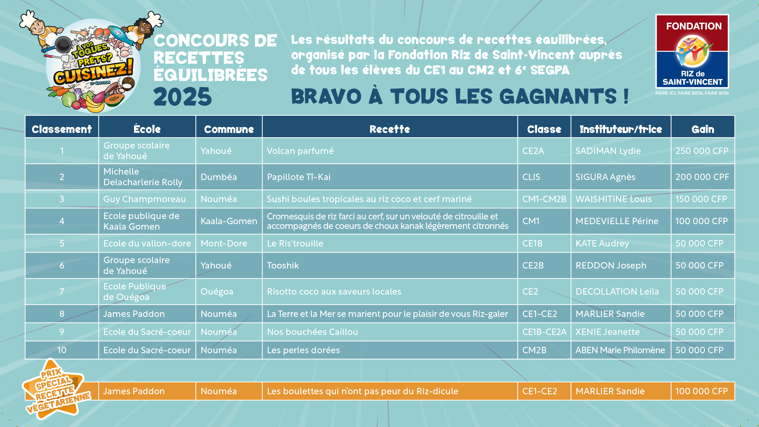 Cette année encore, les classes participantes ont redoublé de créativité pour élaborer un plat équilibré à base de riz, en mettant à l’honneur les produits frais et locaux de Nouvelle-Calédonie.